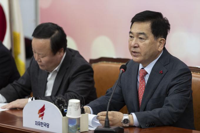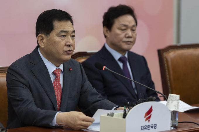 자유한국당 심재철 원내대표(왼쪽)가 7일 오전 서울 여의도 국회에서 열린 당 원내대책회의에 참석해 발언하고 있다.