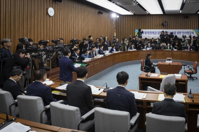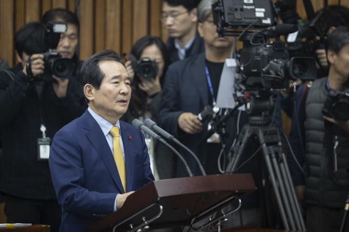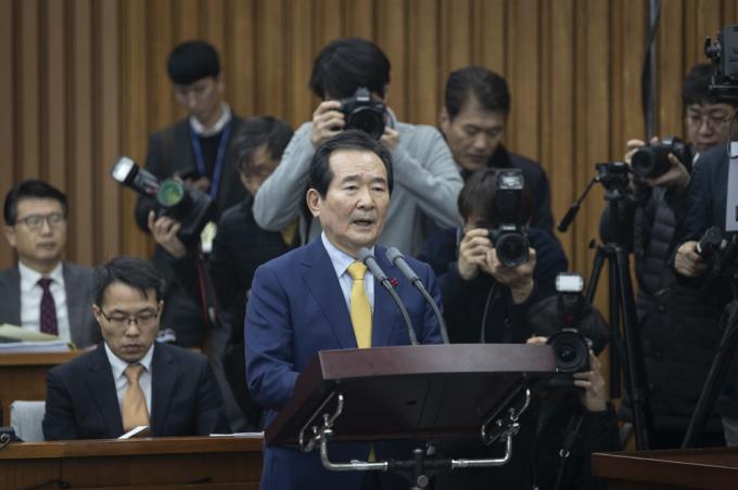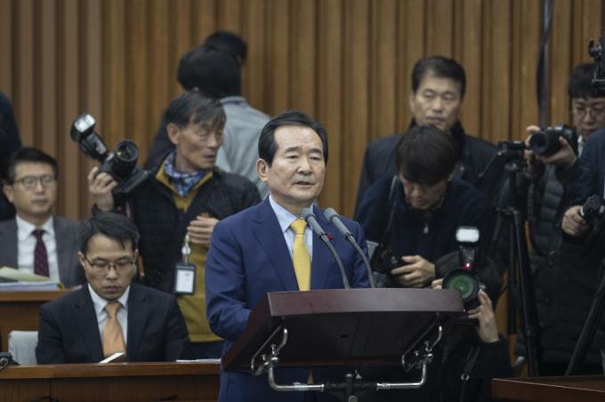 정세균 국무총리 후보자가 7일 오전 서울 여의도 국회 제4회의장에서 열린 인사청문회에서 모두발언을 하고 있다.