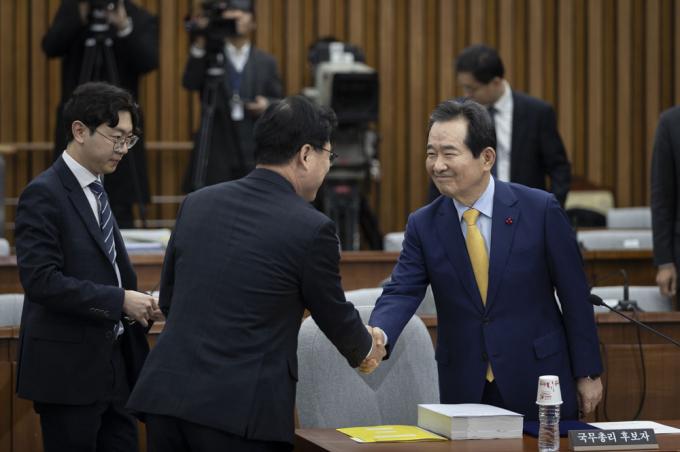 정세균 국무총리 후보자(오른쪽)가 7일 오전 서울 여의도 국회 제3회의장에서 열린 인사청문회에 출석해 더불어민주당 박광온 의원과 악수하고 있다.