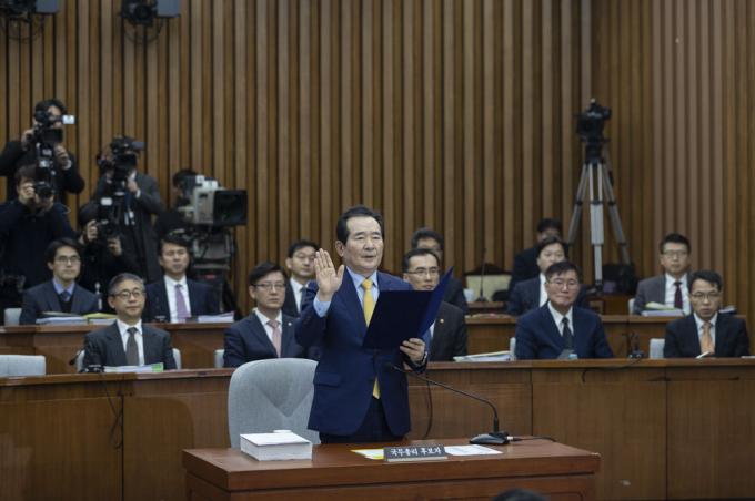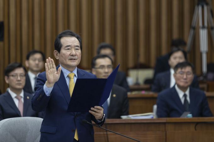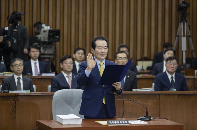 정세균 국무총리 후보자가 7일 오전 서울 여의도 국회 제3회의장에서 열린 인사청문회에 출석해 선서하고 있다.