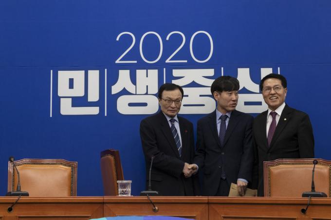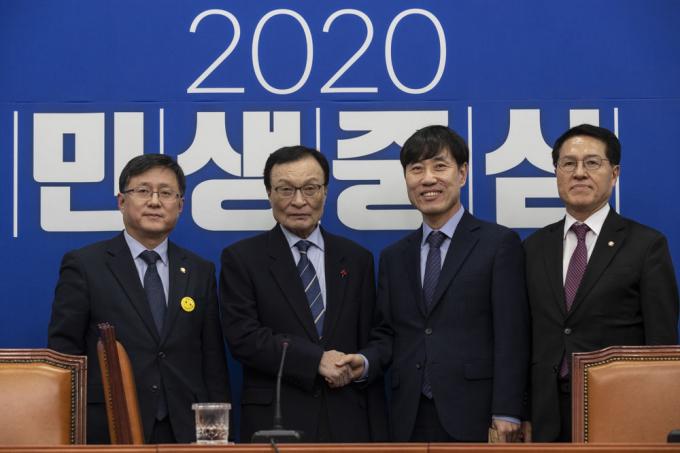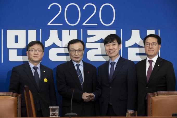 더불어민주당 이해찬 대표(왼쪽 두번째)가 7일 오후 서울 여의도 국회 당대표회의실에서 예방온 새로운보수당 하태경 책임대표와 악수하고 있다.