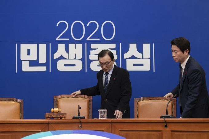 더불어민주당 이해찬 대표(왼쪽)와 이인영 원내대표가 8일 오전 서울 여의도 국회 당대표회의실에서 열린 최고위원회의에 참석하고 있다.