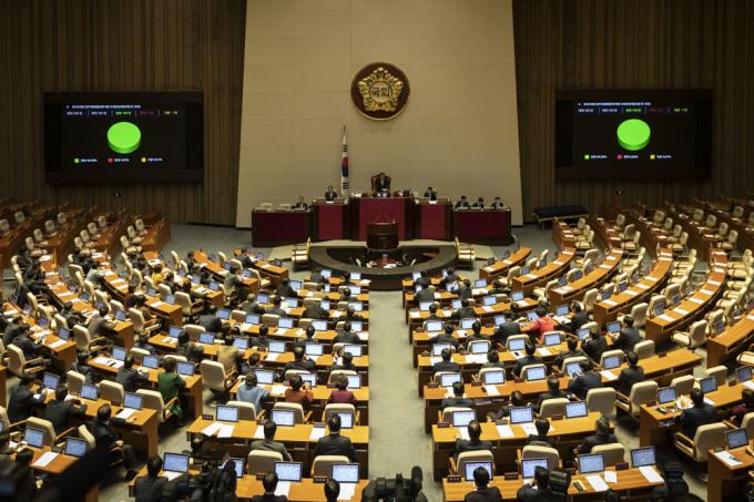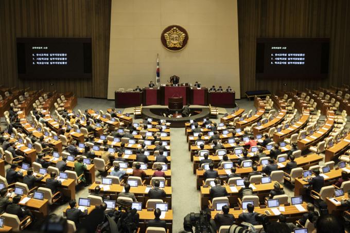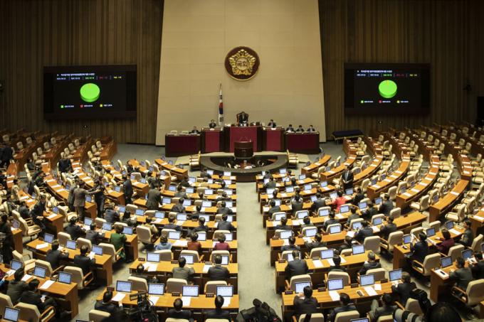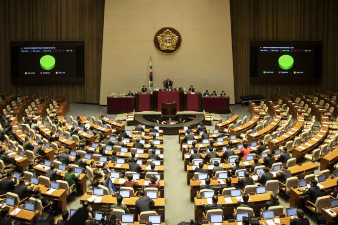 문희상 국회의장이 13일 오후 서울 여의도 국회에서 열린 제375회 국회(임시회) 제1차 본회의에 참석해 교육위원회 소관 사립학교법 일부개정법률안을 가결하고 있다.