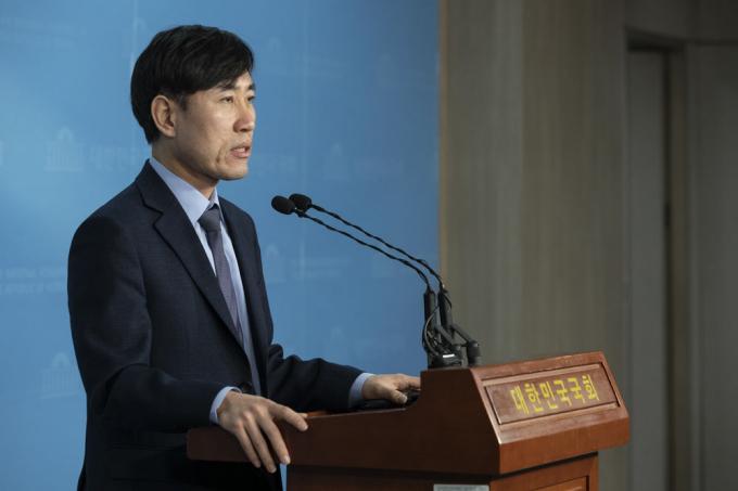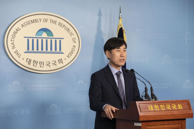 새로운보수당 하태경 책임대표가 14일 오전 서울 여의도 국회 정론관에서 당대표단, 혁신통합추진위원회 관련 입장 발표를 하고 있다.