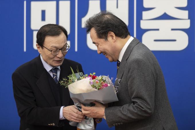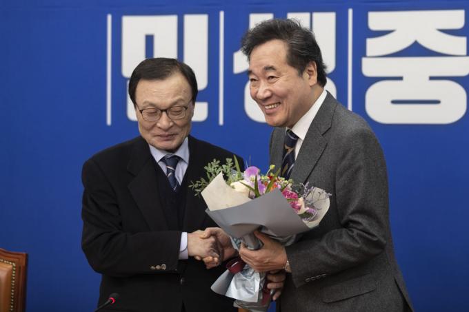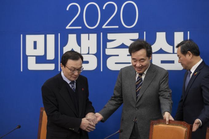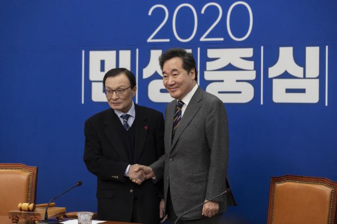 더불어민주당 이해찬 대표(왼쪽)가 15일 오전 서울 여의도 국회에서 열린 최고위원회의에 참석해 당으로 돌아온 이낙연 전 국무총리와 악수하고 있다.