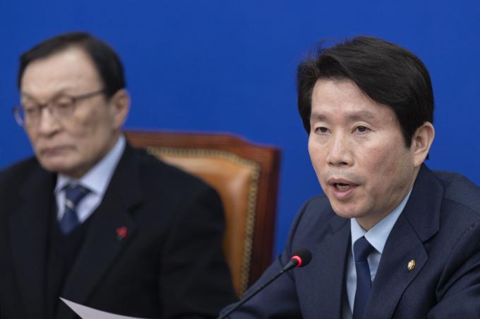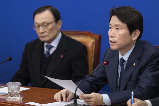 더불어민주당 이인영 원내대표(오른쪽)가 15일 오전 서울 여의도 국회 당대표회의실에서 열린 최고위원회의에 참석해 발언하고 있다.