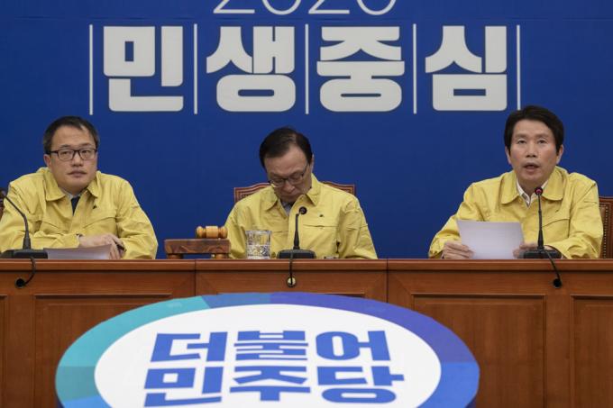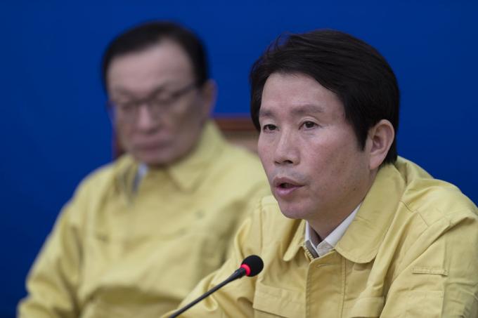 더불어민주당 이인영 원내대표(오른쪽)가 5일 오전 서울 여의도 국회 당대표회의실에서 열린 최고위원회의에 참석해 발언하고 있다.