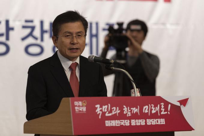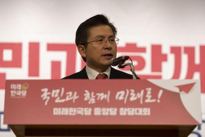 자유한국당 황교안 대표가 5일 오후 서울 여의도 국회 도서관에서 열린 미래한국당 중앙당 창당대회에 참석해 인사말을 하고 있다.