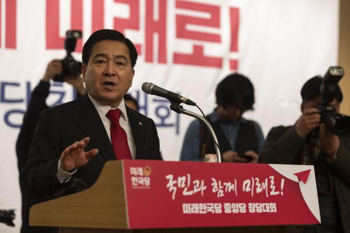 자유한국당 심재철 원내대표가 5일 오후 서울 여의도 국회 도서관에서 열린 미래한국당 중앙당 창당대회에 참석해 인사말을 하고 있다.