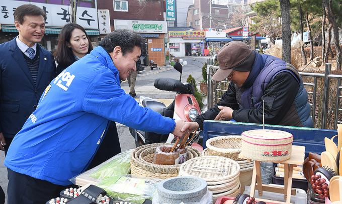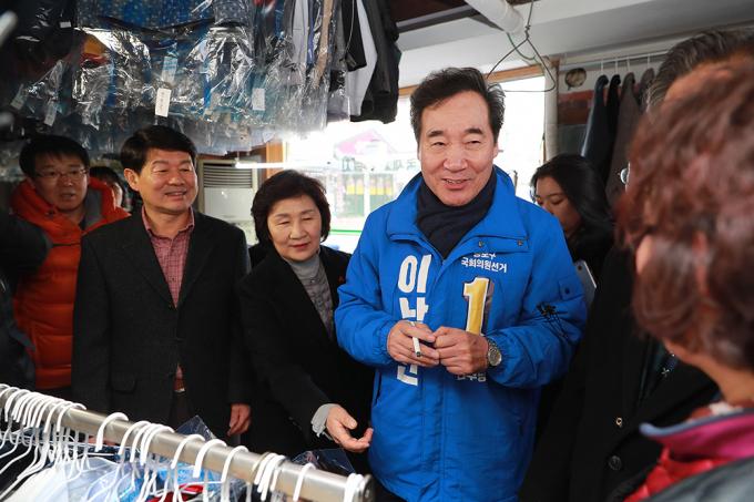더불어민주당 후보로 4.15 총선 종로에 출마하는 이낙연 전 국무총리가 13일 오후 서울 종로구 숭인동 일대를 찾아 지역 상인들과 인사를 나누고 있다.