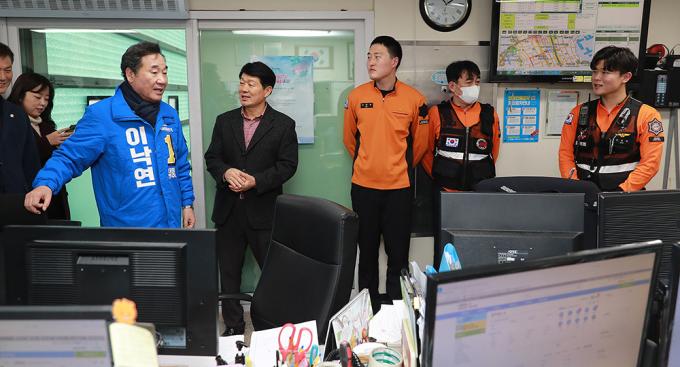 4·15 총선에서 종로에 출마하는 더불어민주당 소속 이낙연 전 국무총리가 13일 오전 서울 종로구 숭인동의 한 소방서를 찾아 대원들과 대화를 나누고 있다.