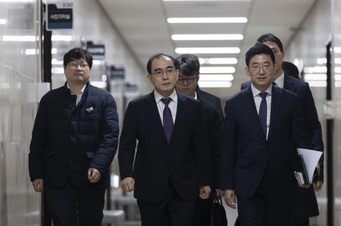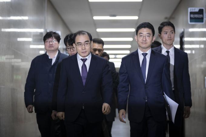 자유한국당 제21대 총선 인재로 영입된 태영호 전 영국 주재 북한 공사(가운데)가 16일 오후 서울 여의도 국회에서 기자간담회를 하기 위해 이동하고 있다.