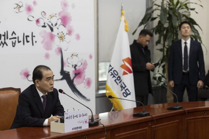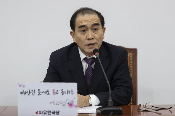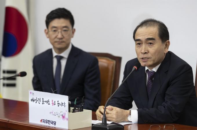자유한국당 제21대 총선 인재로 영입된 태영호 전 영국 주재 북한 공사(오른쪽)가 16일 오후 서울 여의도 국회에서 기자간담회를 하고 있다.