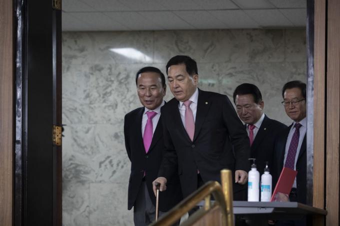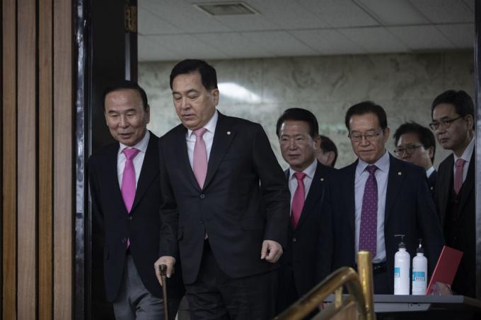 미래통합당 심재철 원내대표가 18일 오전 서울 여의도 국회 제3회의장에서 열린 당 원내대책회의에 참석하고 있다.