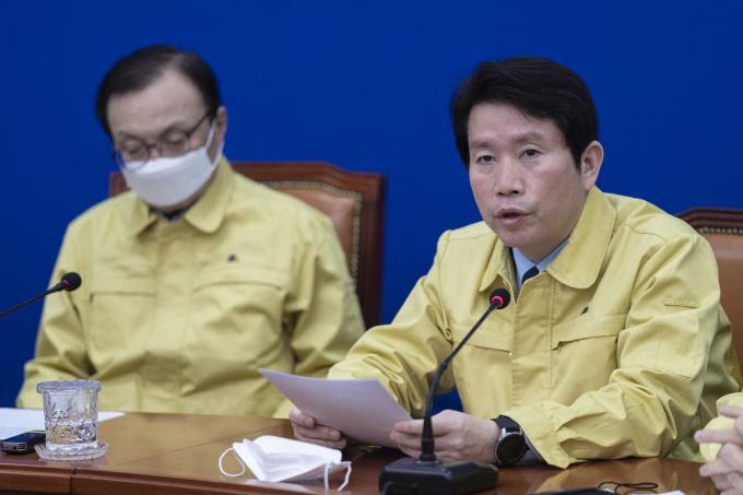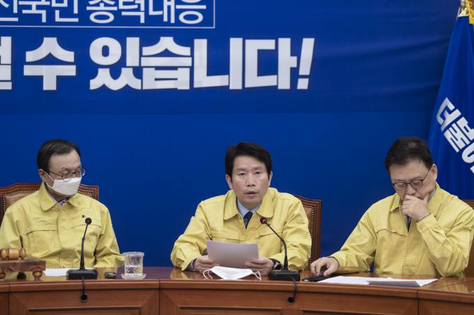 더불어민주당 이인영 원내대표(가운데)가 26일 오전 서울 여의도 국회 당대표회의실에서 열린 최고위원회의에 참석해 발언하고 있다.