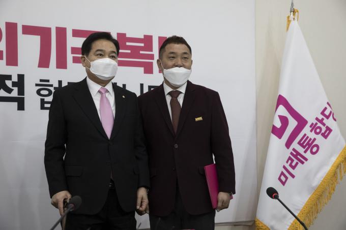 미래통합당 심재철 원내대표(왼쪽)가 3일 오전 서울 여의도 국회에서 당 총선개발특별위원회 반려동물정책개발단장으로 임명된 이웅종 교수와 기념촬영을 하고 있다.