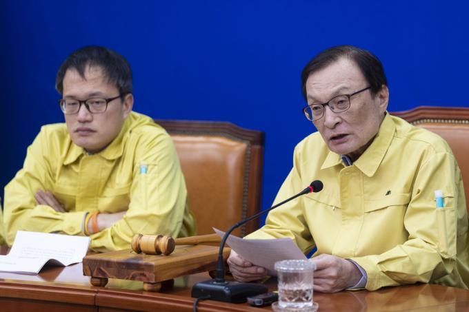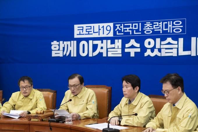 더불어민주당 이해찬 대표(왼쪽 세번째)가 4일 오전 서울 여의도 국회 당대표회의실에서 열린 최고위원회의에 참석해 발언하고 있다.
