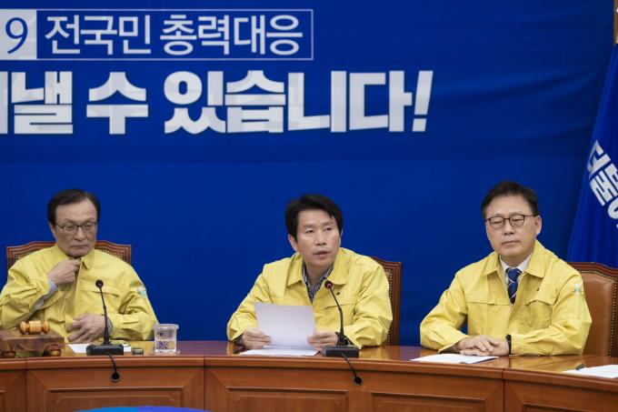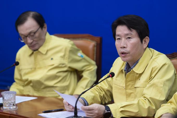 더불어민주당 이인영 원내대표(가운데)가 4일 오전 서울 여의도 국회 당대표회의실에서 열린 최고위원회의에 참석해 발언하고 있다.