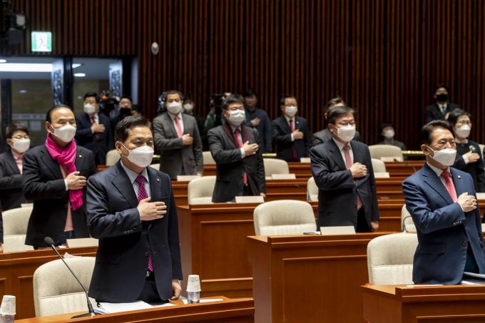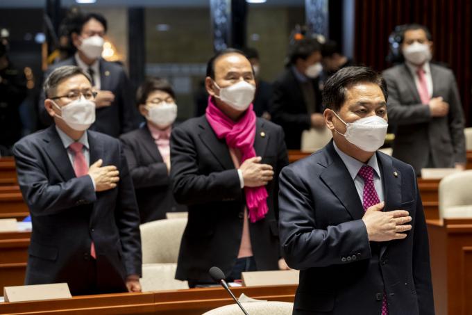 미래통합당 심재철 원내대표와 당 의원들이 4일 오후 서울 여의도 국회 예결위회의장에서 열린 의원총회에 참석해 국민의례를 하고 있다.