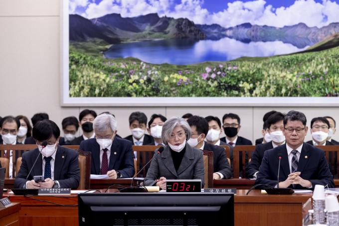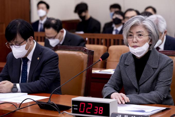 강경화 외교부장관이 4일 오후 서울 여의도 국회에서 열린 외교통일위원회 안건심사에 출석해 의원 질의에 답하고 있다.