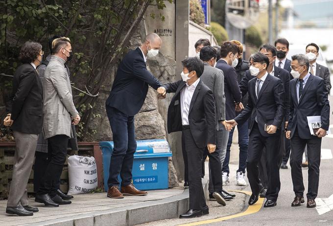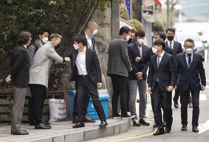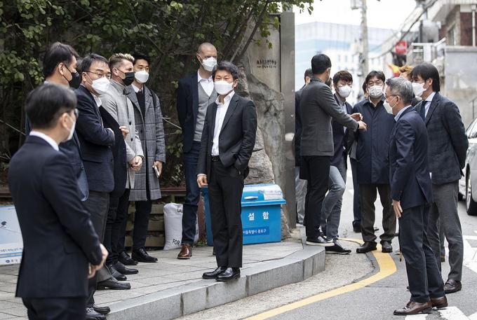 정몽규 대한축구협회 회장을 비롯한 임직원들이 17일 오전 서울 종로구 대한축구협회 앞에서 코로나19 혈액 수급 차질을 해결하기 위한 KFA 단체 현혈에 앞서 인사를 나누고 있다.