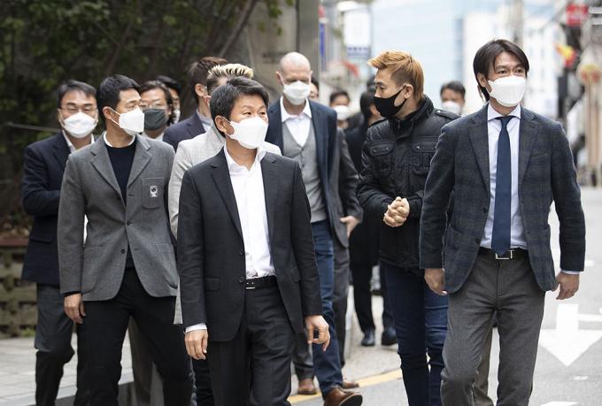 정몽규 대한축구협회 회장과 홍명보 전무이사를 비롯한 임직원들이 17일 오전 서울 종로구 대한축구협회 앞에서 코로나19 혈액 수급 차질을 해결하기 위한 KFA 단체 현혈에 앞서 인사를 나누고 있다.