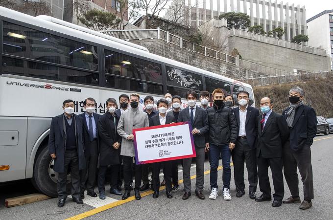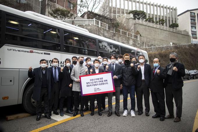 정몽규 대한축구협회 회장을 비롯한 임직원들이 17일 오전 서울 종로구 대한축구협회 앞에서 코로나19 혈액 수급 차질을 해결하기 위한 KFA 단체 현혈에 앞서 기념사진을 찍고 있다.