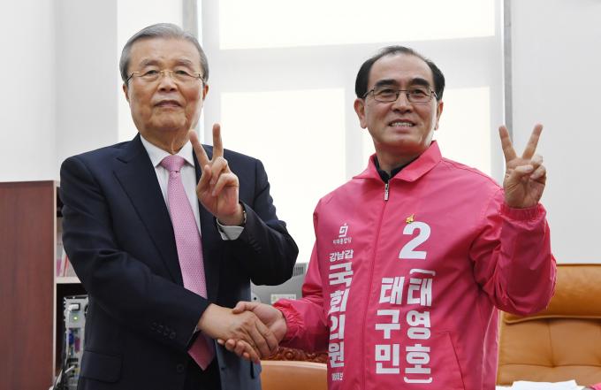 미래통합당 김종인 총괄선대위원장(왼쪽)이 30일 오전 서울 여의도 국회에서 태구민 강남갑 후보자와 선거 관련 대화에 앞서 기념촬영을 하고 있다.