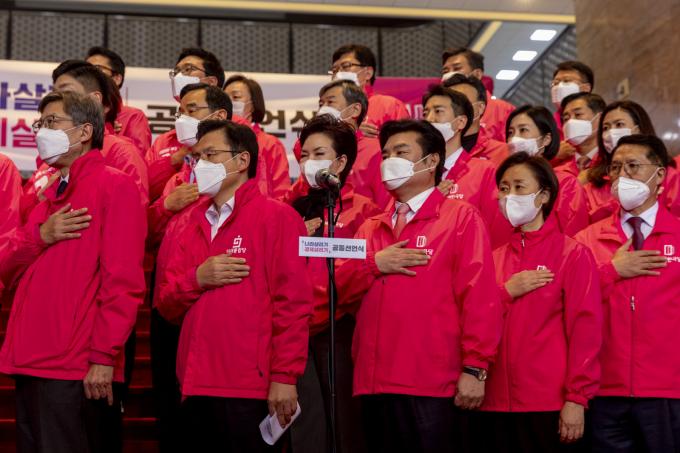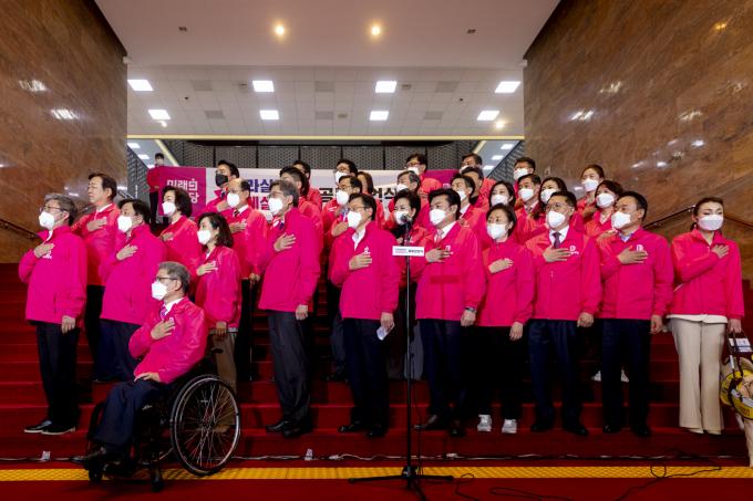 미래통합당 황교안 대표(앞줄 왼쪽 두 번째)와 미래한국당 원유철 대표(세 번째) 등이 1일 오후 서울 여의도 국회 로텐더홀 앞 계단에서 열린 '나라 살리기·경제살리기' 공동 선언식에 참석해 국민의례 하고 있다.