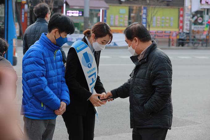 더불어민주당 광진을 고민정 후보가 4·15 제21대 국회의원선거 공식 선거운동 첫날인 2일 오전 서울 광진구 자양사거리에서 시민으로부터 간식을 전달받고 있다.