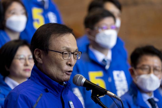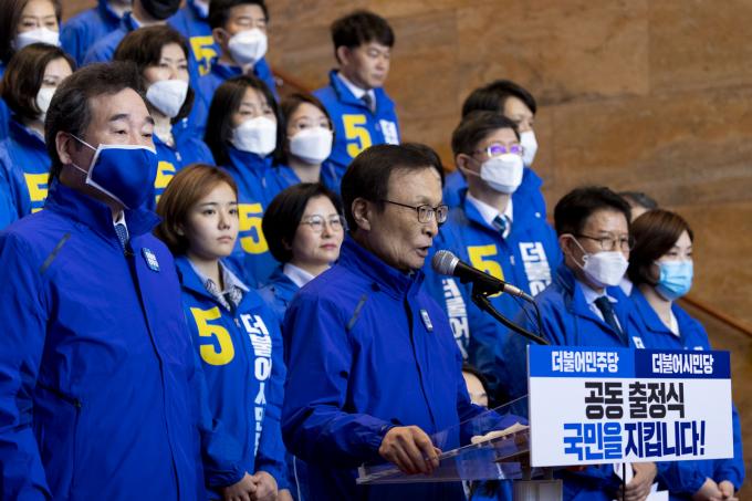 더불어민주당 이해찬 대표가 2일 오전 서울 여의도 국회 로텐더홀 앞 계단에서 열린 제21대총선 더불어민주당-더불어시민당 중앙선대위 합동출정식에 참석해 발언하고 있다.