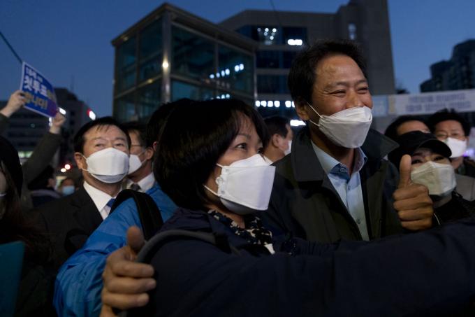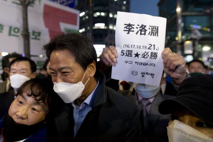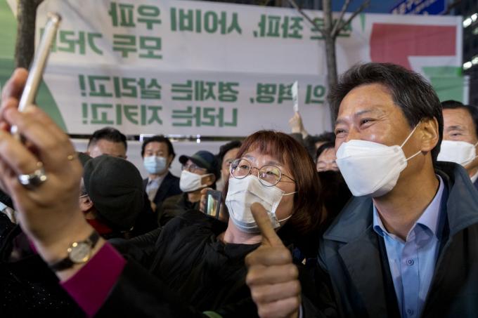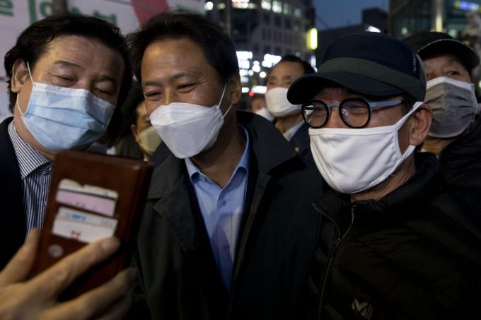 임종석 전 대통령비서실장이 14일 오후 서울 동묘앞역 인근에서 열린 더불어민주당 이낙연 후보 집중유세 현장을 찾아 이 후보 지지를 호소하며 구민들과 기념사진을 찍고 있다.