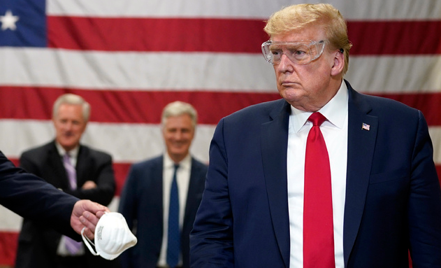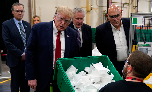 도널드 트럼프 미국 대통령은 5일(현지 시각) 미 애리조나주(州) 피닉스시에서 N95 마스크를 생산하는 기업인 '하니웰' 공장을 견학했다. 트럼프 대통령의 외부 행사 참석은 지난 3월 28일 해군 병원선 'USNS 컴포트' 호를 배웅하기 위해 버지니아주 노퍽을 방문한 이후 38일 만이다. 보건 전문가의 우려에도 불구하고 이날 마스크를 착용하지 않은 트럼프 대통령의 모습은 구설수에 올랐다.
