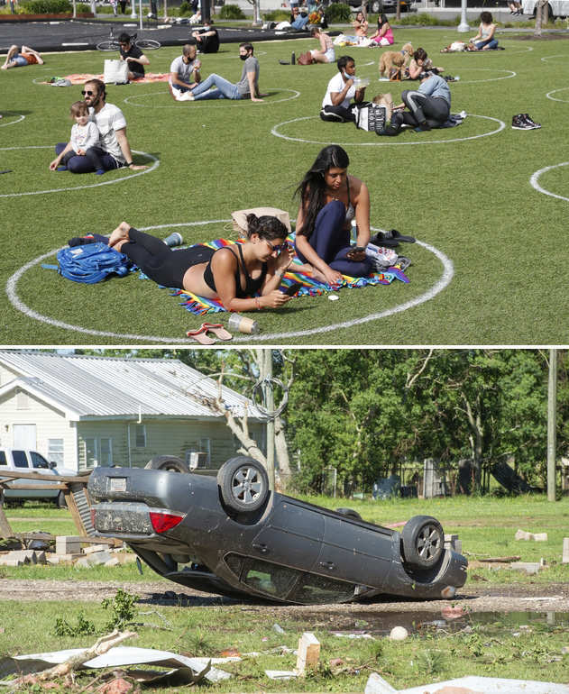 코로나19에 잠시 멈췄을지언정 인간의 삶도 다르지 않다. 둥근 원 안에 갇혀서라도 일광욕을 즐긴다. 시련도 바이러스만이 아니다. 자연의 소용돌이는 마을을 휩쓸며 자동차를 뒤집어 눕힌다.