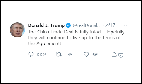 22일(현지시간) 트럼프 대통령은 "중국 무역 협상은 완전히 온전하다"며 "그들이 계속해서 합의의 조건에 부응하기를 바란다"고 자신의 트위터를 통해 밝혔다.