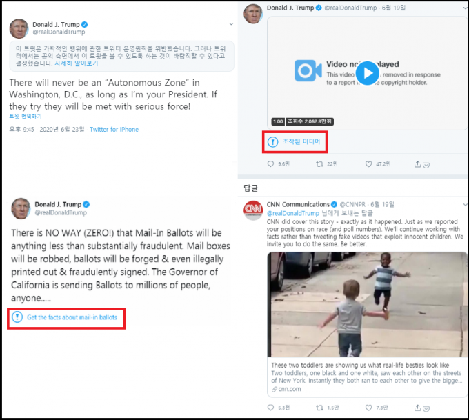 지난주에는 트럼프 대통령이 올린 두 명의 아기 영상에 '조작된 미디어'라는 경고 딱지를 달았다. 이는 CNN이 트럼프에 대해 악의적으로 보도한 것처럼 조작한 영상이었다.