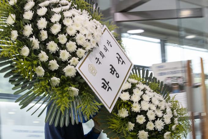 박병석 국회의장 조화가 10일 오전 서울 종로구 서울대병원 장례식장에 마련된 고 박원순 서울시장의 빈소로 들어가고 있다.KPI뉴스 / 정병혁 기자 jbh@kpinews.kr