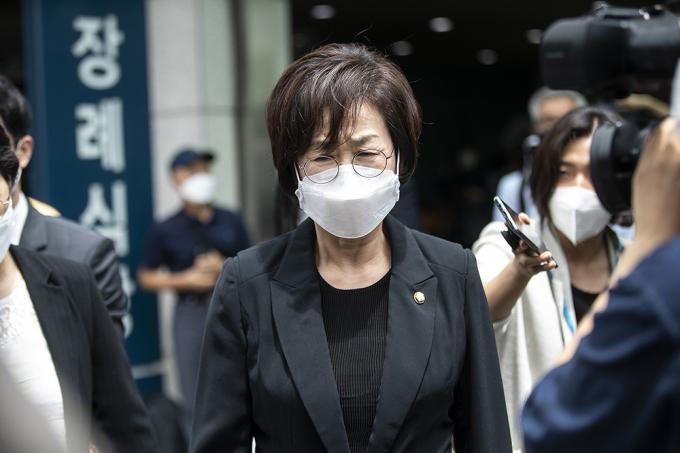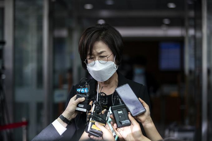 김상희 국회부의장이 10일 오후 서울 종로구 서울대병원 장례식장에 마련된 고 박원순 서울시장의 빈소에서 조문을 마친 뒤 취재진의 질문에 답하고 있다.