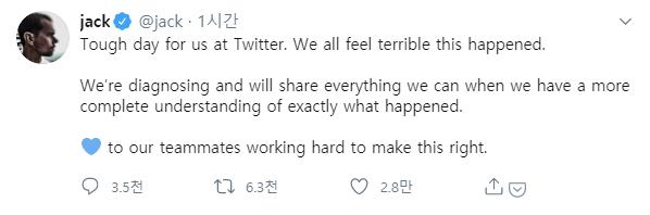 잭 도시 트위터 CEO는 "우리에게 힘든 하루"라면서 "이 일이 일어난 것을 끔찍하다고 느낀다"고 말했다.
