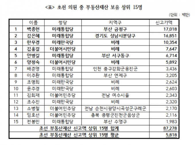 초선의원 중 재산 상위 10%에 해당하는 15명의 부동산재산 신고액은 평균 58억1800만 원에 달했다.