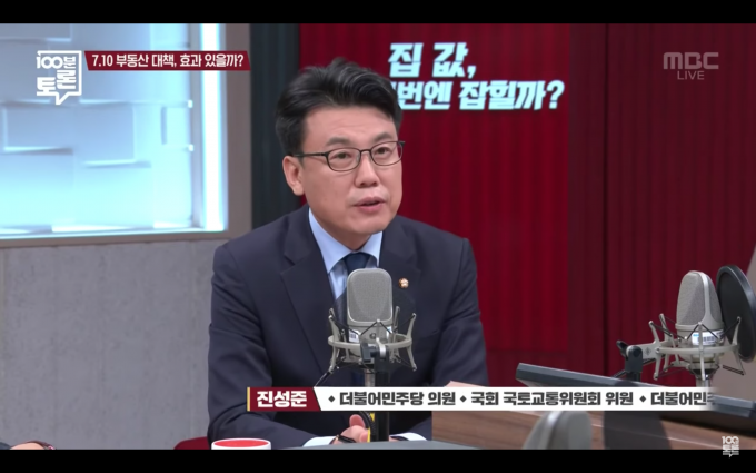 진성준 의원은 전날 밤부터 이날 새벽까지 방송된 MBC '100분 토론'에서 진보 측 패널로 출연해 7·10 부동산 대책과 관련해 "이제 근본적인 처방을 하게 됐다"고 평가했다.