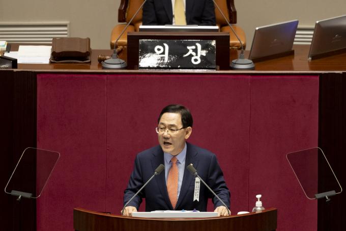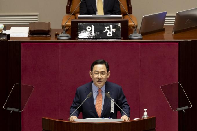 미래통합당 주호영 원내대표가 21일 오전 서울 여의도 국회 본회의장에서 '국정에 관한 교섭단체 대표연설'을 하고 있다.