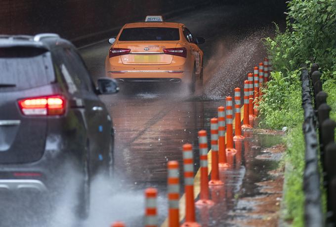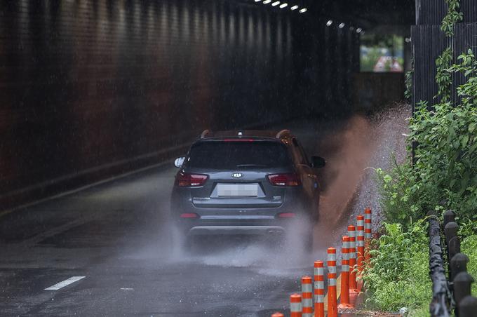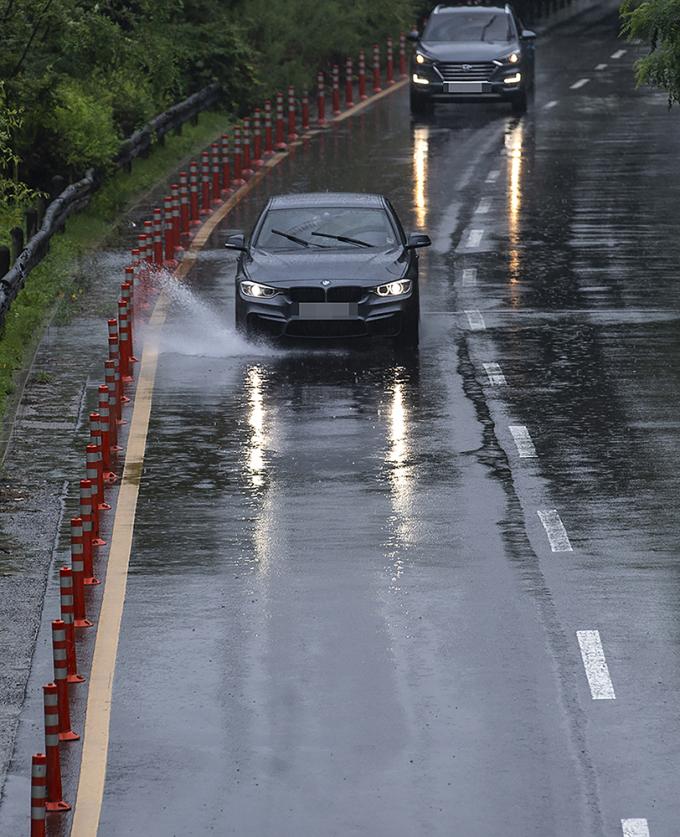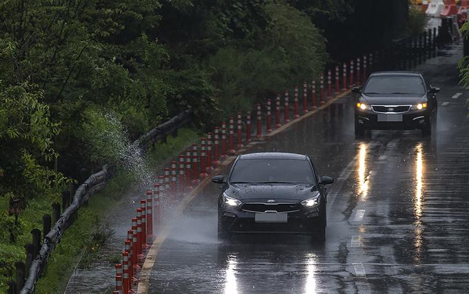 장맛비가 내리는 22일 오전 서울 영등포구 여의하류IC 인근 도로에서 차량들이 물보라를 일으키며 지나가고 있다.[정병혁 기자]2020.07.22