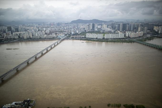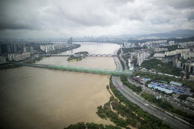 지난 주말부터 중부지방에 집중되고 있는 폭우로 한강 수위가 상승한 3일 오후 63스퀘어에서 바라본 한강에 흙탕물이 흐르고 있다.