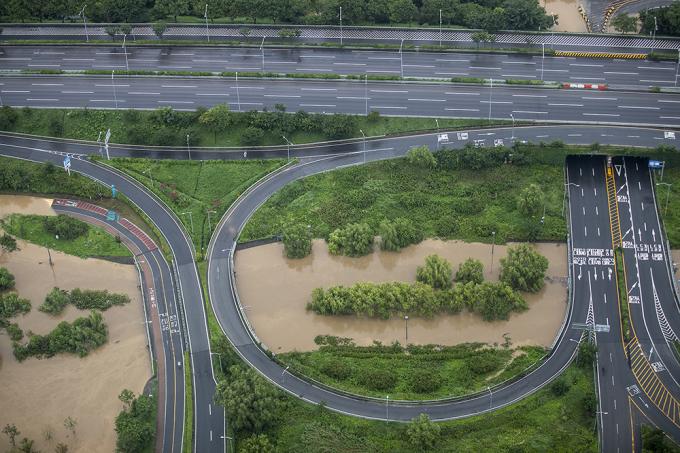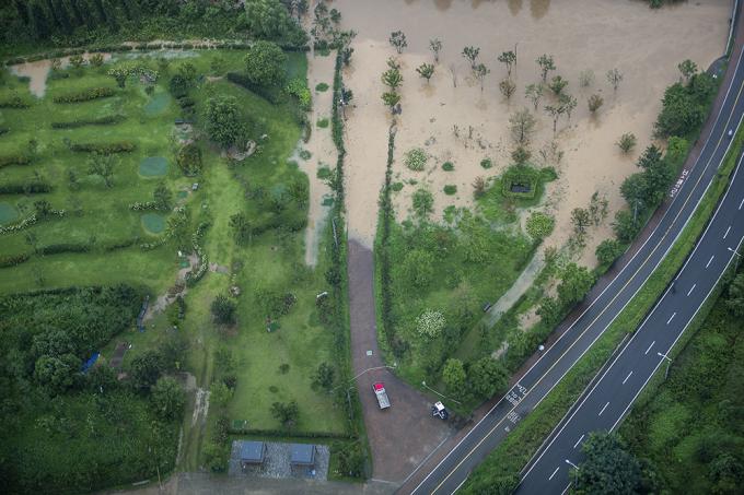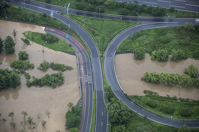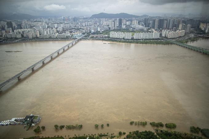 지난 주말부터 중부지방에 집중되고 있는 폭우로 한강 수위가 상승한 3일 오후 63스퀘어에서 바라본 한강공원이 물에 잠겨 있다.