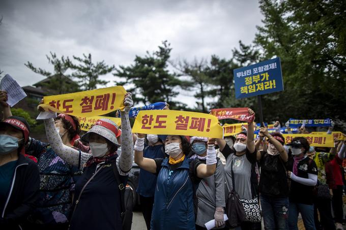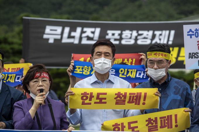 이강덕 포항시장이 11일 오후 서울 종로구 청와대 사랑채 앞에서 열린 포항지진특별법 시행령 개정 촉구 기자회견에서 피켓을 들고 있다.