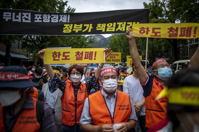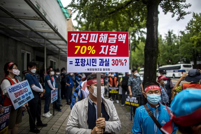 포항 11.15 촉발지진 범시민대책위원회 소속 주민 및 관계자들이 11일 오후 서울 종로구 청와대 사랑채 앞에서 포항지진특별법 시행령 개정 촉구 기자회견을 하고 있다. 이날 포항 지진 피해주민 300여명은 상경 기자회견을 열고 '포항지진특별법 시행령 개정(안)의 피해지원금 지급 기준에 규정된 피해 금액의 70%를 지원한다'는 조항이 아닌 '100% 피해구제'를 해줄 것을 촉구했다.