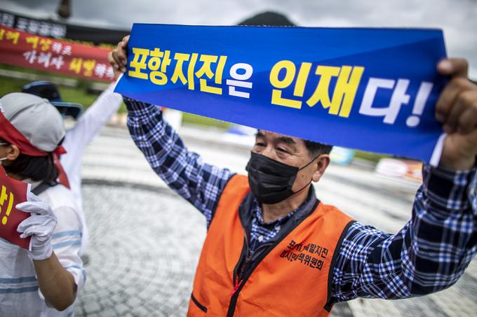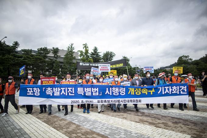 포항 11.15 촉발지진 범시민대책위원회 소속 주민 및 관계자들이 11일 오후 서울 종로구 청와대 사랑채 앞에서 포항지진특별법 시행령 개정 촉구 기자회견을 하고 있다.