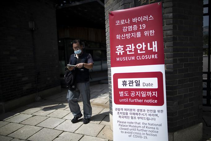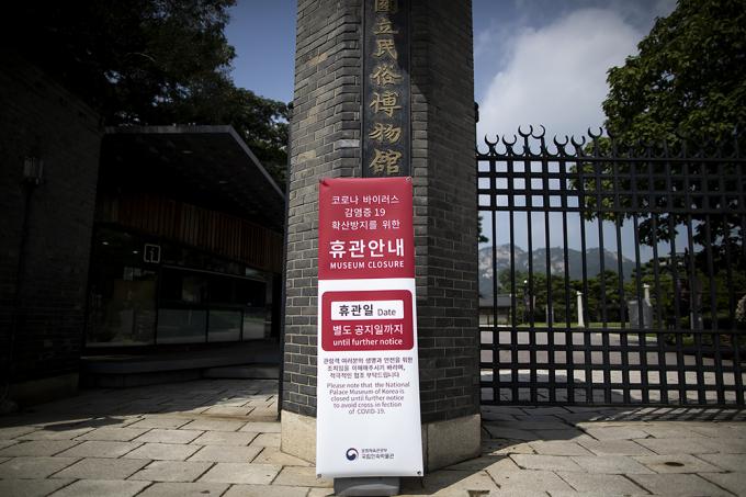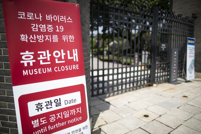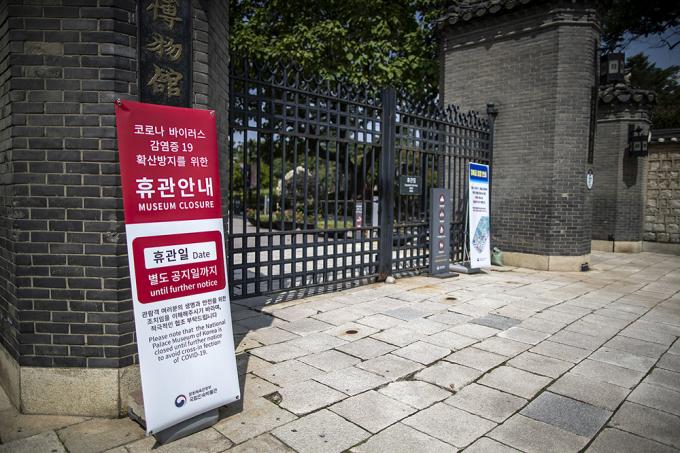 코로나19 확산에 따라 수도권 내 사회적 거리두기 2단계가 시행된 19일 서울 종로구 국립민속박물관 입구에 휴관을 알리는 안내문이 붙어있다.