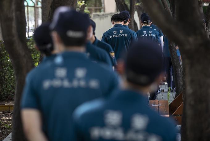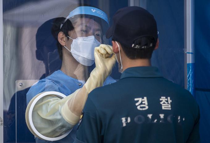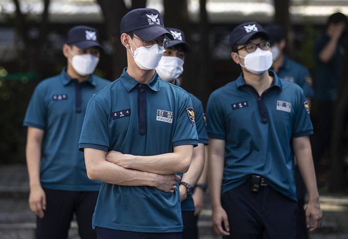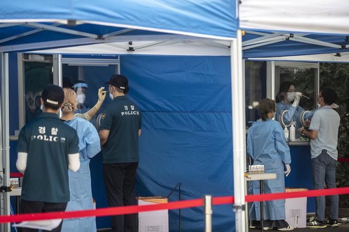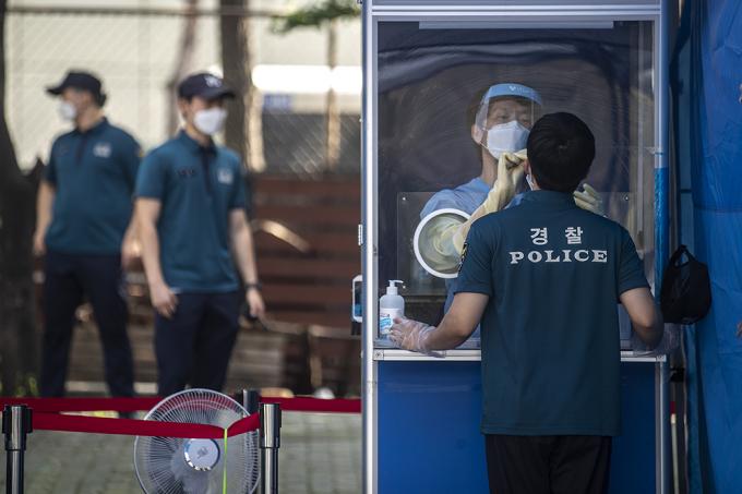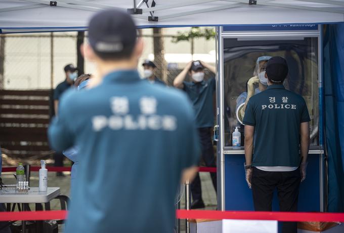 지난 15일 서울 도심에서 열린 집회에서 질서유지를 담당했던 경찰 관계자 등이 19일 오후 서울 중구 서울지방경찰청 기동본부에 차려진 코로나19 선별진료소에서 검사를 받고 있다.